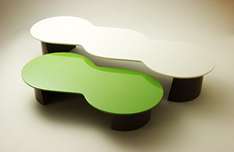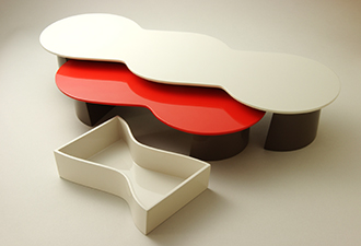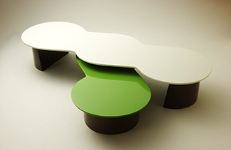 「卓上卓」は自身でネーミングしたもの。ダイニングテーブルの上に置いて食卓を立体的に使うために考えたものですが、テーブル上に花々を飾るなどの演出、何かの飾り台に使っても良し。二つの円を接線でつないだ独自のフォルムを考案し、意匠登録も申請。2連と3連のバリエーションを図面化して製作依頼、数か月後完成品を受け取ったときはその有用性と可能性を実感しました。