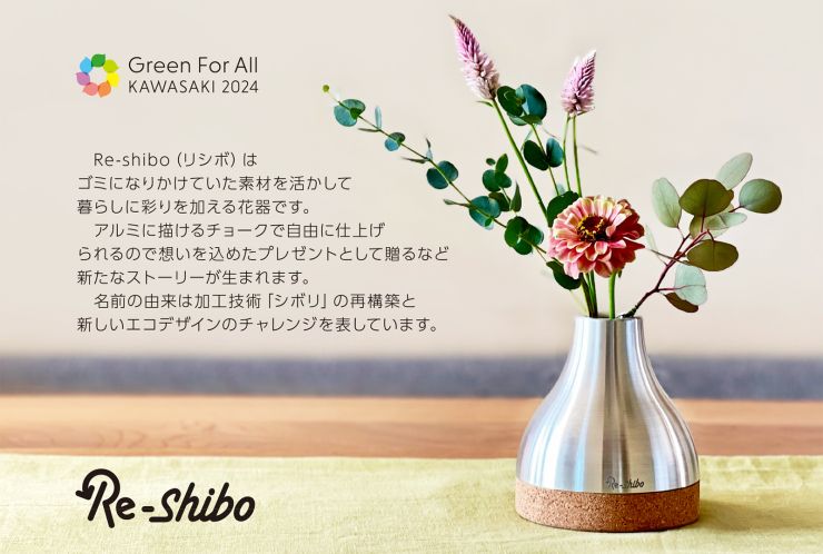 エコ・サステイナブルをテーマとした花器。工場端材のアルミをヘラ絞り加工で美しく造形。コルク台座は日本中のホテルから集められたワインキャップからリサイクル。また付属のチョークでメッセージや模様など自由にデザインできます。